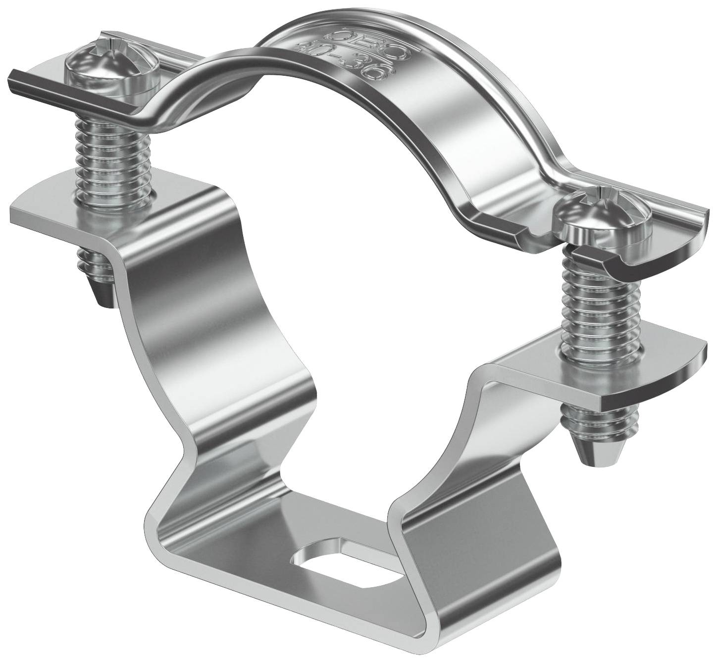 Abstandschelle zur Montage von Rohren und Kabeln an Wand, Decke und Boden. Mit selbstsicherndem Oberteil. Befestigung über Langloch. Ab der Schellengröße 20 geeignet für Montage mit Nagelgerät oder Bolzensetzgerät. Zugelassen für den Funktionserhalt nach DIN 4102 Teil 12, Funktionserhaltklassen E 30 bis E 90 (außer ALU).