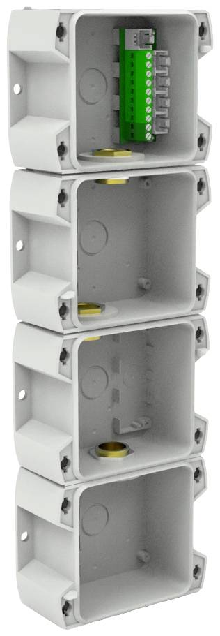 - Grundgehäuse (wie auch die Einsatzmodule) sind aus schlagfestem Polycarbonat gefertigt (IK 08) und sie sind spannungsneutral, erst die Moduleinsätze bestimmen die Spannungsversorgung