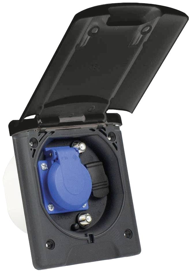 3 in 1 Lösung: 1x Schutzkontaktsteckdose 230 V, 16 A, mit Klappdeckel