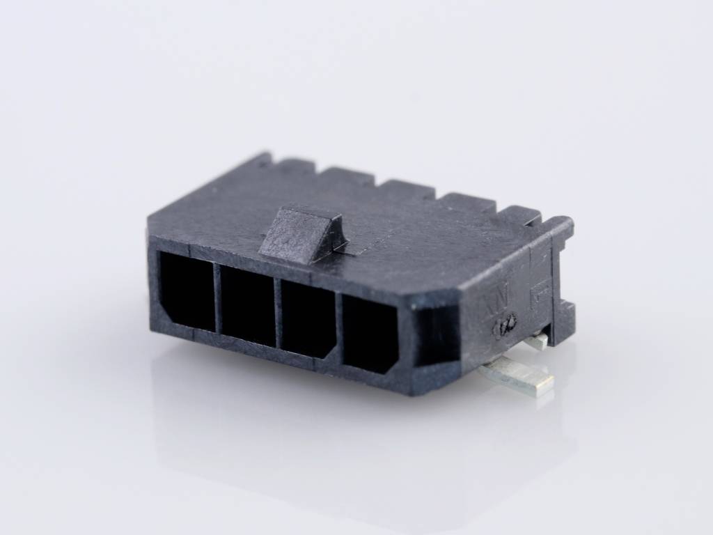 Micro-Fit 3.0 Right-Angle Header, 3.00mm Pitch, Single Row, 4 Circuits, with Solder Tab, Tin, Glow-Wire Capable, Black, Tape and Reel