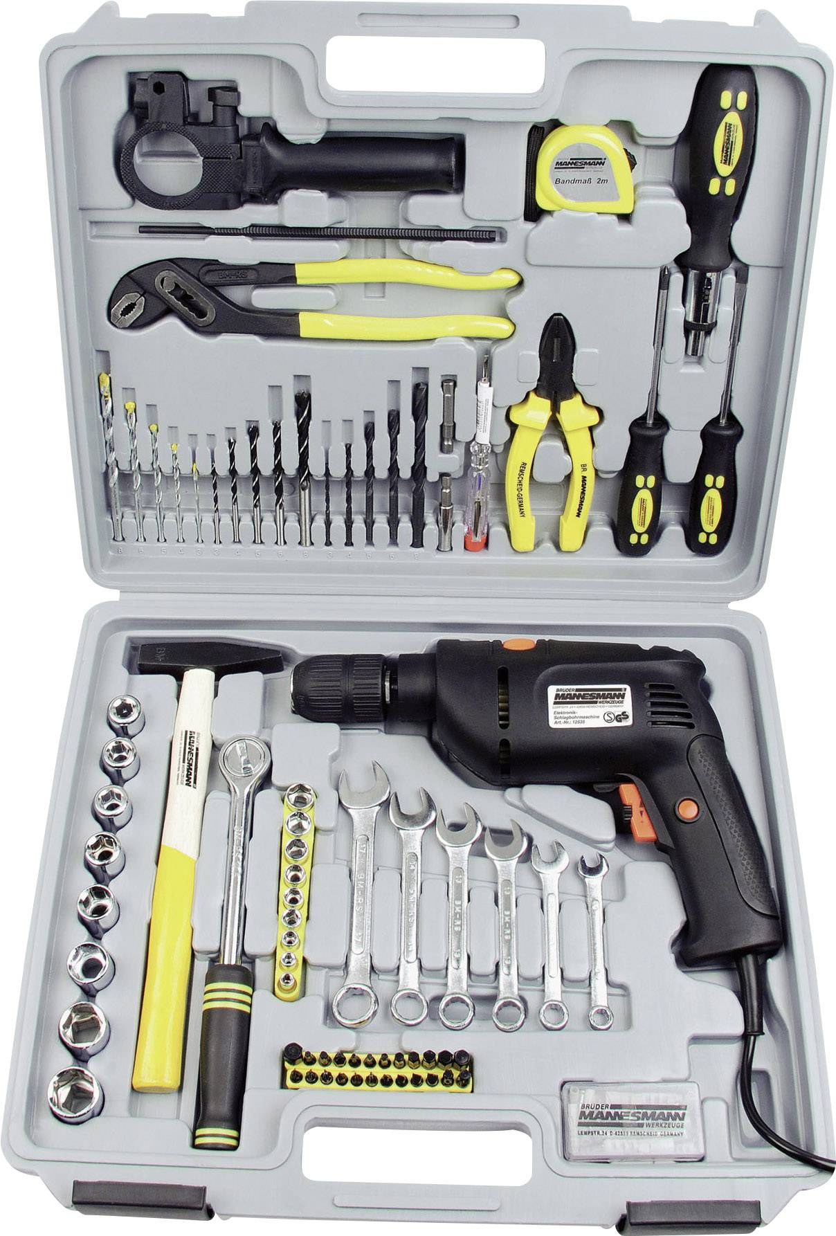 1 Elektronik-Schlagbohrmaschine 810 W, mit Handgriff, Tiefenanschlag und Ersatzkohlen-Satz · 5 HSS-Bohrer für Stahl: 3/4/5/6/8 mm · 5 HM-Bohrer für Beton: 3/4/5/6/8 mm · 5 Holzbohrer: 3/4/5/6/8 mm · 1 Schraubknarrengriff mit verstellbarem Kopf und Softgrip · 24 Bits aus gehärtetem Werkzeugstahl: 10 Innensechskant: 2/2,5/3/4/5/6/7/8/9/10 mm · 3 Pozidriv: 0/1/2 · 3 Kreuz: 0/1/2 · 4 Flach: 3/4/5/6 mm · T20/T30/T40/T50 · 1 Magnethalter, verchromt · 1 Umschaltknarre 1/2" · 9 Steckschlüsseleinsätze 1/4": 4/5/6/7/8/9/10/11/13 mm · 8 Steckschlüsseleinsätze 1/2" 10/11/12/13/14/17/19/21 mm · 1 Adapter für 1/4" Steckschlüsseleinsätze · 1 Schlitzschraubendreher mit Softgrip · 1 Kreuzschraubendreher mit Softgrip · 1 Bandmaß 2 m, mit Stopper · 1 Kombizange 160 mm mit schwerer Handschutzhülle · 1 Wasserpumpenzange 240 mm, mit durchgestecktem Gewerbe und Schutzhülle · 1 Schlosserhammer, 200 g · 6 Gabel/Ring-Schlüssel: 8/10/12/13/14/17 mm · 1 Spannungsprüfer · 1 Sc