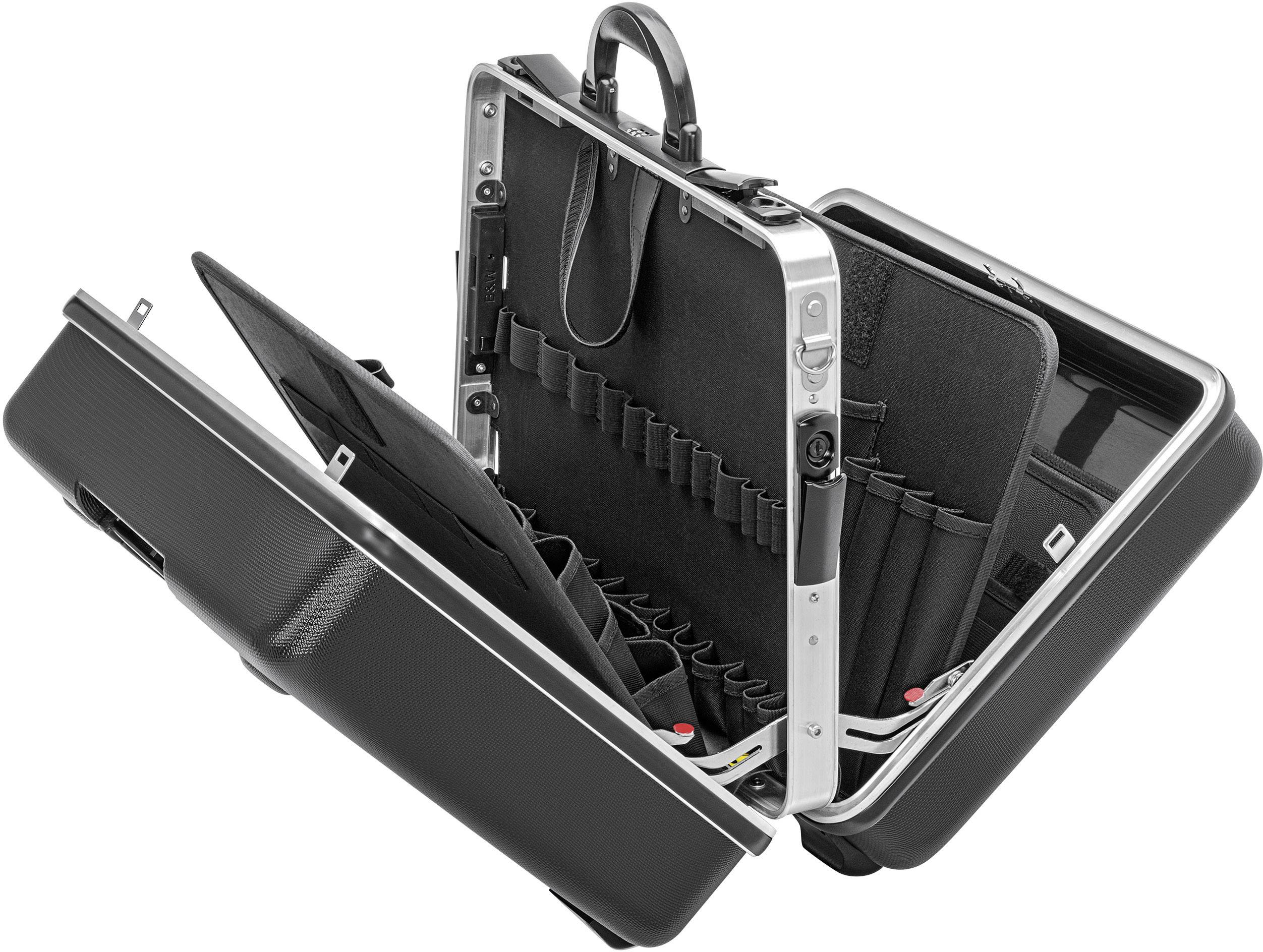 Strapazierfähige Ausführung aus ABS-Material, schwarz. Umlaufender Aluminium-Rahmen mit D-Ringen zum Anbringen eines Trageriemens und fest montierter, stabiler, beidseitig bestückbarer Mittelwand, mit vielseitigen Einsteckmöglichkeiten durch elastische Schlaufen und zwölf kleine Taschen. Handfreundlicher Tragegriff und im Boden eingelassene Halterung für einen "Trolley" (Artikel optional erhältlich unter der Art.-Nr. 00 21 40 T). Metallscharniere. Belastbarkeit bis 30 kg. Ein- oder beidseitig zu öffnen. Boden und Deckel lassen sich voneinander unabhängig öffnen. Frei stehend in allen Öffnungslagen durch beidseitig angebrachte, bei 45° und 90° rastende Deckelhalter mit Scharniermechanik. 3-stelliges Zahlenschloss und zwei Kippschlösser zur Fixierung des Deckels. Herausnehmbares Dokumentenfach und herausnehmbare Werkzeugtafel, einseitig bestückbar, mit dreizehn Werkzeugtaschen. Zwei Kippschlösser zur Fixierung des Bodens. Bodenschale, Höhe 58 mm, durch flexible Einsätze unterteilbar und Abdecktafel mit sechs großen Werkzeugtaschen, per Druckknopf fixierbar. Abmessungen, außen (B x H x T): 490 x 255 x 410 mm Abmessungen, innen (B x H x T): 445 x (105 + 105) x 350 mm. Strapazierfähige Ausführung aus ABS-Material, schwarz. Umlaufender Aluminium-Rahmen mit D-Ringen zum Anbringen eines Trageriemens und fest montierter, stabiler, beidseitig bestückbarer Mittelwand, mit vielseitigen Einsteckmöglichkeiten durch elastische Schlaufen und zwölf kleine Taschen. Handfreundlicher Tragegriff und im Boden eingelassene Halterung für einen "Trolley" (Artikel optional erhältlich unter der Art.-Nr. 00 21 40 T). Metallscharniere. Belastbarkeit bis 30 kg. Ein- oder beidseitig zu öffnen. Boden und Deckel lassen sich voneinander unabhängig öffnen. Frei stehend in allen Öffnungslagen durch beidseitig angebrachte, bei 45° und 90° rastende Deckelhalter mit Scharniermechanik. 3-stelliges Zahlenschloss und zwei Kippschlösser zur Fixierung des Deckels. Herausnehmbares Dokumentenfach und herausnehmbare Werkzeugtafel aus schmutzabweisenden PP-Hohlkammerplatten, einseitig bestückbar, mit 13 Werkzeugtaschen. Zwei Kippschlösser zur Fixierung des Bodens. Bodenschale, Höhe 58 mm, durch flexible Einsätze unterteilbar und Abdecktafel mit sechs großen Werkzeugtaschen, per Druckknopf fixierbar.