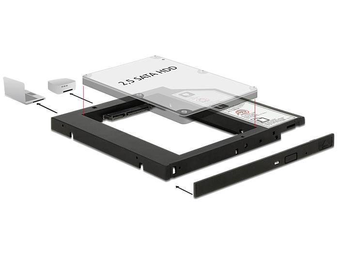 Diesen Delock Einbaurahmen im Slim-Format können Sie in einen 5.25″ SATA Slim Schacht einbauen und darin eine 2.5″ SATA Festplatte betreiben. Im Lieferumfang befindet sich eine universelle Frontblende, die Sie zum Beispiel beim Einbau in einen Mini PC nutzen können, bzw. wenn die vorhandene Blende Ihres Notebooks nicht passt.