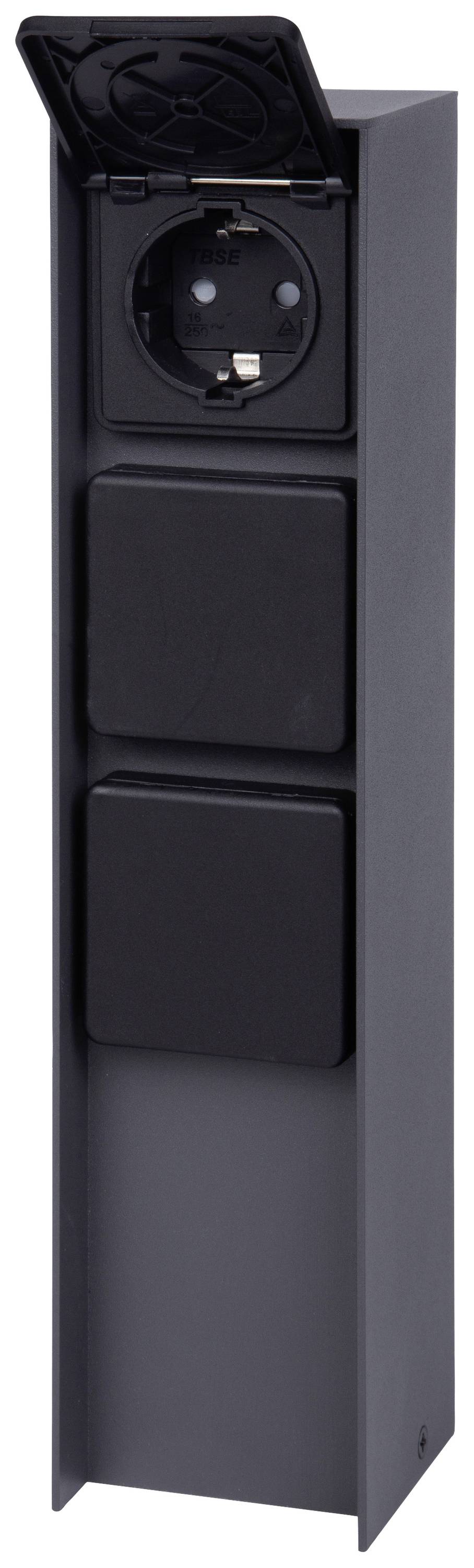 Stromsäule im ansprechenden, modernen Design aus hochwertigem, rostfreiem Alu-Druckguss und einem kompakten, eckigen 33 cm hohen und 8 cm x 8 cm Format