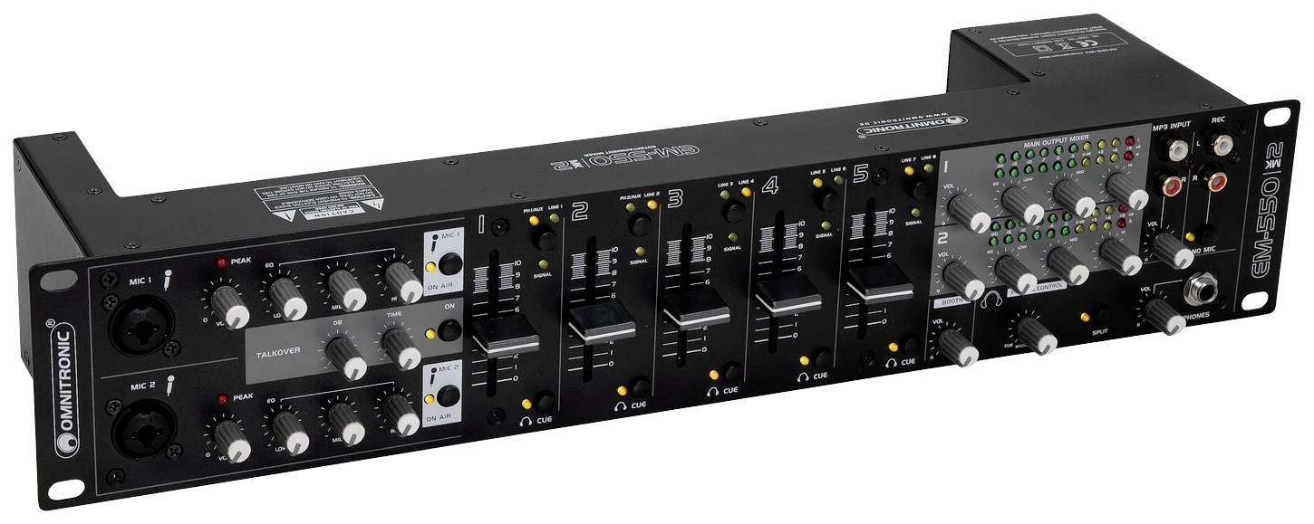 2 regelbare Masterausgänge mit 3-Band-EQ und 10-stelliger Stereo-LED-Pegelanzeige