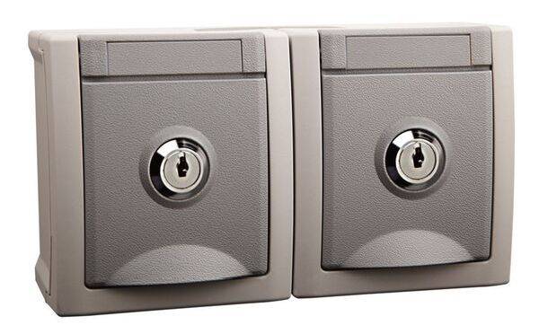 2-fach Schutzkontakt Steckdose mit Sicherheitsschloss im Klappdeckel, Schließcodierung 9, waagrechte Montage, grau, Möglichkeit zum Beschriften mit 90591300-DE, mit Steckanschluss 2P+E, vorverdrahtet mit 2,5 qmm flexibel, Schloss mit 2 gleichen Schlüsseln, im verschlossenen Zustand nicht aufschraubbar oder demontierbar, Nennspannung 250 V, Nennstrom 16A, glasfaserverstärktes thermoplastisches Material, Schlagfestigkeit IK05, Schutzart IP54