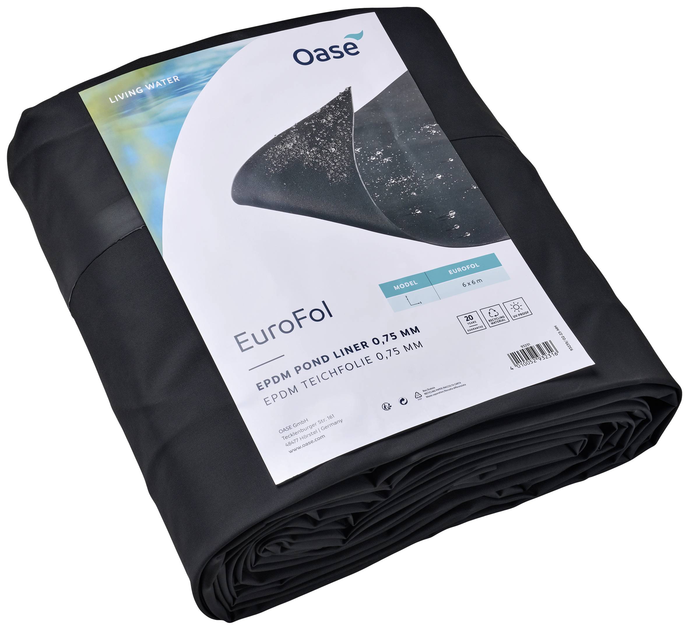 Verlegfertiger Teichfolienabschnitt EuroFol aus umweltfreundlichem Kautschuk in 6 x 6 m. Die schwarze, 0,75 mm starke EPDM-Folie ist dank ihrer Flexibilität und Dehnbarkeit besonders leicht zu verarbeiten und zu verlegen. Einflüssen, wie UV-Strahlung oder Ozon, trotzen ihre Eigenschaften, die sie außergewöhnlich langlebig machen. Für die Fisch- und Pflanzenwelt ist sie nach WrC bestens geeignet. Wir empfehlen zusätzlich das OASE Teichvlies als Schutz der Teichfolie vor Steinen oder Geröll. Vertrauen Sie auf OASE Qualität, denn Sie erhalten eine Garantie von 20 Jahren.
