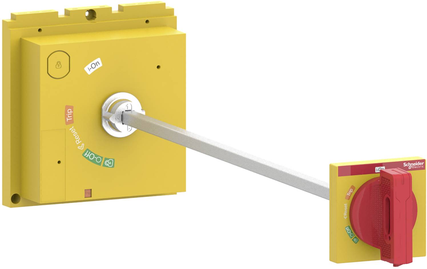 Es handelt sich um einen Drehantrieb mit Türkupplung für die Baugruppen ComPacT NSX 400/630 und PowerPact Multistandard L. Es eignet sich für die galvanische Trennung und wird für Standardanwendungen verwendet. Es behält den Zugriff auf die Einstellungen des Auslösegeräts und auf den Auslösetaster bei. Er ist mit einem roten Griff an der gelben Vorderseite ausgestattet. Es gibt eine Anzeige der drei Gerätepositionen O (AUS), I (EIN) und ausgelöst. Diese erweiterte Version ermöglicht den Betrieb von Geräten, die an der Rückseite der Schaltanlagen montiert sind, von der Vorderseite der Schaltanlage aus. Der Abstand zwischen der Rückseite des Leistungsschalters und der Schaltanlagentür beträgt zwischen 185 mm und 600 mm. Die Schutzarten sind IP55 und IK08. Dieser Drehantrieb kann in der Stellung AUS mit 1 bis 3 Vorhängeschlössern verriegelt werden (Bügeldurchmesser 5 bis 8 mm). Optional ist es möglich, einen Schlüsselschalter Ronis oder Profalux auf der Unterseite des Griffs zu installieren, um die gleiche Funktion zu erhalten wie bei einem Vorhängeschloss.