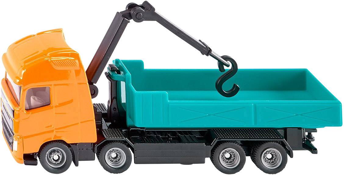 500 PS, vier Achsen, Hakenlift und Kran: Der SIKU SUPER Volvo FH Abrollkipper ist der Multifunktions-Lkw für die Baustelle. Der Kran lässt sich um 360 Grad drehen und nimmt schwere Lasten an den Haken. Ausgestattet mit zwei stabilen Gelenken, kann der Kran zudem in verschiedene Positionen manövriert werden. Mit dem Hakenlift lässt sich die Mulde auf der Baustelle präzise abladen und zum beladen wieder auf das Fahrzeug ziehen.