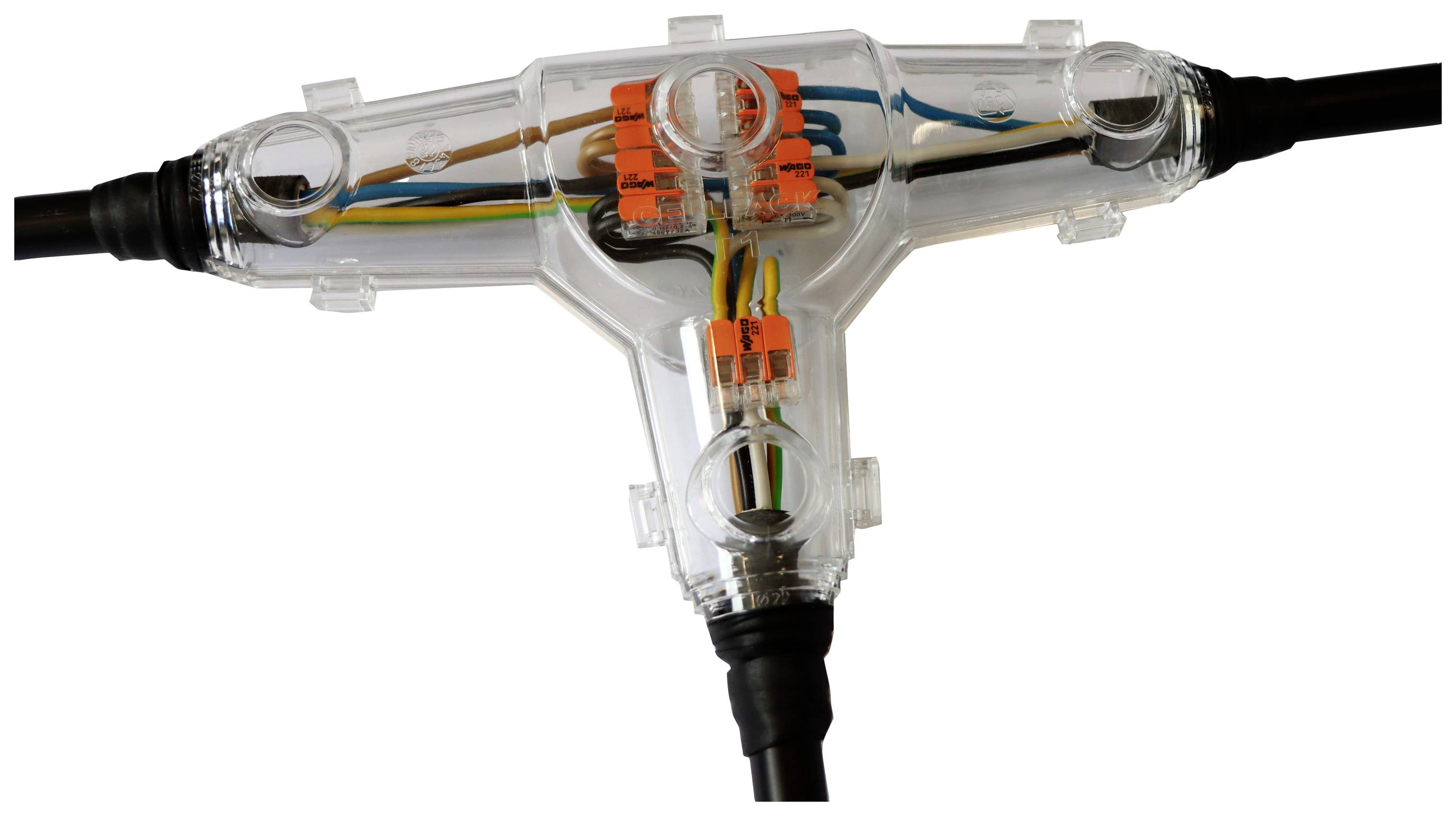 Universell verwendbar zum Abzweigen von Kabeln und Leitungen mit Isolierungen aus PVC, PE, VPE und EPR (z. B. N(A)YY, NYM). Mit hydrolysebeständigem PUR-Gießharz EG. Mit Einzelabzweigklemmen, geeignet für Kupfer- und Aluminiumleiter.