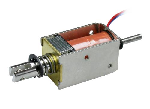 Bistabile Hubmagnete Typ Kuhnke BI 17. Ausführung: bistabiler Kombimagnet (stoßend und ziehend), Nennhub: 4,0 mm, Nennspannung: 24 VDC, Nennleistung: 9,5 W, zulässige relative Einschaltdauer (ED): 25 %, Anschlüsse: 100 mm lange Litzen mit freien Enden. Anfangskraft: 2,4 N, Endkraft: 8,0 N, Isolierstoffklasse: E, Grenztemperatur: +120 °C, Prüfspannung: 800 Veff., Anzugszeit: 22 ms, Abfallzeit: 11 ms, Magnetgewicht: ca. 46 g, Ankergewicht: ca. 12 g. Typ: BI 17-F-24VDC 25% ED, Hubmagnet