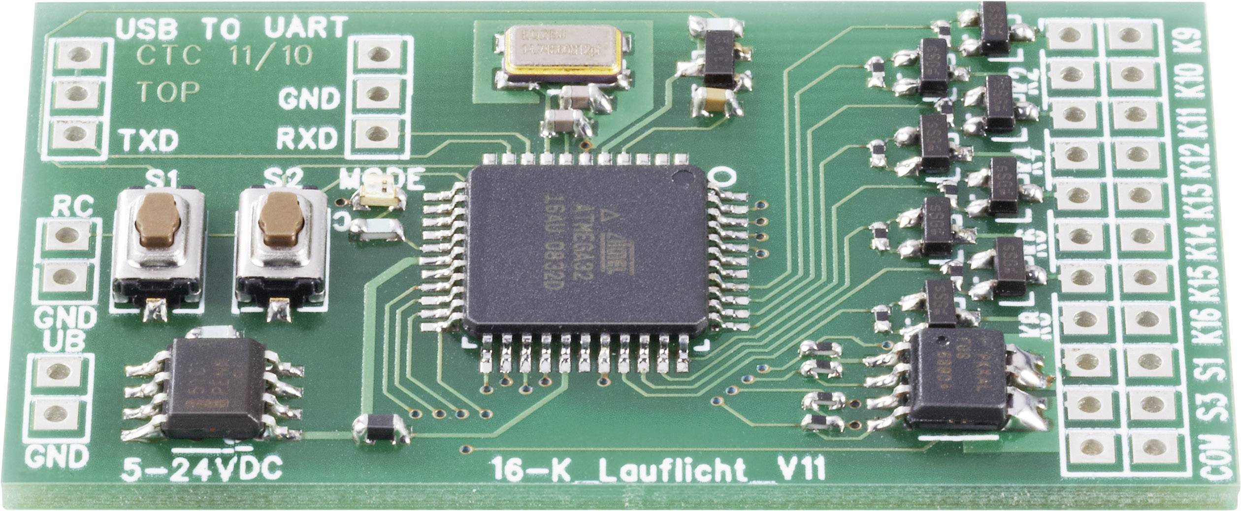 Mit dieser LED-Lauflichtsteuerung können bis zu 16 LEDs oder LED-Gruppen angesteuert werden. Im Auslieferungszustand stehen bereits 17 verschiedene Lichtsequenzen zur Verfügung. Außerdem verfügt die Steuerung über ein Automatik-Programm mit deren Hilfe man alle Lichtsequenzen in einem 6 Sekunden Rhythmus durchspielen kann und anschließend zur nächsten Lichtsequenz umgeschalten wird. Darüber hinaus kann die Geschwindigkeit aller Lichtsequenzen in 26 Stufen eingestellt werden. Die Platine kann entweder im „Stand alone“- oder im „RC“-Modus betrieben werden. Im „Stand alone“-Modus erfolgt die Umschaltung bzw. die Auswahl der einzelnen Lauflichtsequenzen per Tastenbetätigung am Modul. Im „RC“-Modus kann über einen freien Empfängerkanal die Lauflichtfunktion per Fernsteuersender umgeschaltet werden. Zusätzlich stehen im „RC“-Modus noch 4 schaltbare Ausgänge für Sonderfunktionen zur Verfügung. Die Programmierung der 16-Kanal LED-Lauflichtsteuerung (Open Source C-Control Pro Programm) kann bei Bedarf individuell an das Modell angepasst werden.