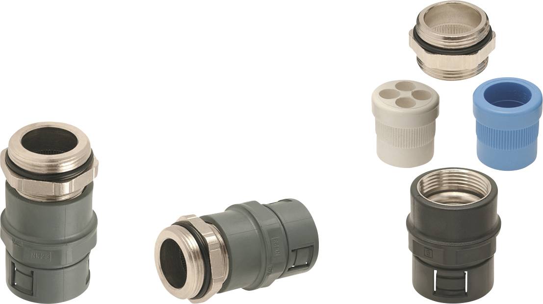 Wellschlauchverschraubung aus Polyamid kombiniert mit Kabelverschraubung aus Messing (Einfach-Dichteinsatz) für eine sichere und schnelle Verbindung. Passend für parallelgewellte Schutzschläuche Typ HELUcond.
