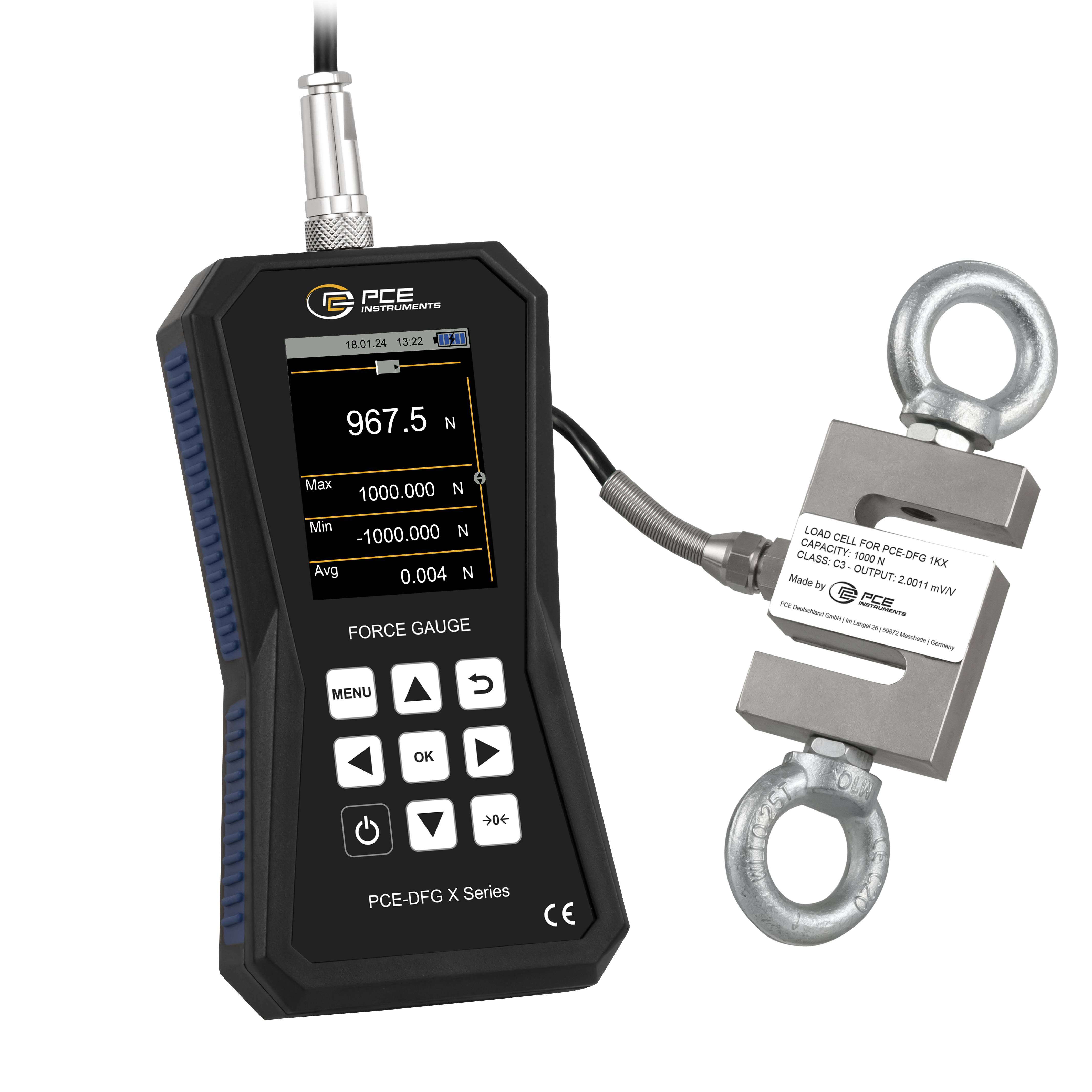 Der interne Speicher von 32 GB bietet Platz für 30 Millionen Messpunkte. Damit können Messprotokolle erstellt, gespeichert und exportiert werden. Das Kraftmessgerät verfügt über eine USB-C Schnittstelle, über die die Messdaten in die PC-Software eingelesen werden können. Das Gerät ist mit einem grafischen LCD ausgestattet, das die Messwerte sowohl numerisch als auch grafisch darstellt. Zusätzlich zeigt ein Balkendiagramm den Messwert im gewählten Messbereich an. Die Messzelle ist nach IP67 geschützt und kann somit auch in rauer Industrieumgebung eingesetzt werden.