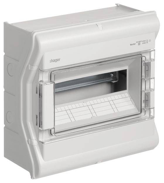 Kleinverteiler, vector, APV, IP65, 12PLE, UV-stabil, m. metr. Leitungseinführung. Installationskleinverteiler aus Polycarbonat (UV-beständig), nach DIN EN 60670-24, nach DIN 43871. Zum Einbau von Geräten bis 63 A nach Maßnorm DIN 43 880 mit 70 mm oder 85 mm Einbautiefe, Bemessungsspannung AC 400 V/50 Hz. Bestehend aus Kunststoffunterteil mit Hutprofilschiene aus verzinktem Stahlblech, Vorprägung für metrische Leitungseinführungstüllen (oben, unten), seitliche Vorprägungen für Verbindungstüllen zur Verbindung von zwei oder mehreren Verteilern nebeneinander. Oberteil mit 46 mm Geräteschlitz. Klarsichttür frontbündig, rechts oder links anschlagbar, plombierbar, abschließbar, Verteiler anflanschbar.