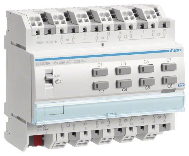 Rollladenaktor 8fach, 6A /230V~, KNX. Schaltausgang zum Schalten von 8 Rollladenausgängen. Über die Funktion kann der Fahrbefehl AUF/AB/Stopp ausgeführt werden. Prozentansteuerung des Rollladen zum Fahren in eine vordefinierten Position. Mit der Sonnenschutzfunktion kann in Verbindung mit einem Außensensor die Helligkeit pro Raum gesteuert werden. Mit Alarmfunktion zur Steuerung des Rollladen in eine definierte Position. Sicherheitsabfahrt solange die Taste gedrückt bleibt. 64 Szenenfunktion pro Kanal. Logikblock zur Steuerung des Ausgangs in Abhängigkeit zum Ergebnis einer logischen Verknüpfung. Preset-, Sperrfunktion, Zwangssteuerung. Das Gerät setzt die Businformationen in entsprechende Befehle um. Die Ausgänge werden über die Systemleitung von den ihnen zugeordneten Eingängen geschaltet. Alle Ausgänge haben am Gerät eine Handbedienung, die auch sperrbar ist, sowie eine Schaltzustandsanzeige mittels LED und Betriebsstundenzähler pro Ausgang. Das Gerät kann mit einem Diagnostikwerkzeug ausgelesen werden. Beschriftungsmöglichkeit direkt am Gerät.