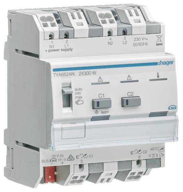 Universal-Dimmaktor 2-fach KNX, 2x300W, ESL/LED, kombinierbar. KNX Systembeschreibung Das KNX System ist ein flexibles, aufwärtskompatibles Installationsbussystem (früher EIB = European Installation Bus) für den Einsatz in der Gebäudesystemtechnik. Es ist speziell zugeschnitten auf besondere Anforderungen bezüglich des Komforts, der Möglichkeit zur flexiblen Raumnutzung, der Kombination von zentraler und dezentraler Steuerung, der intelligenten Verknüpfung von Gewerken und Systemen, Kommunikationsmöglichkeiten, Umweltverträglichkeit, der Energie- und Betriebskostenminimierung sowie der Funktionen Anzeigen, Melden, Bedienen, Überwachen und Detektieren. Durch seinen dezentralen Aufbau ermöglicht es in Wohn- und Zweckbauten, unabhängig von der Anlagengröße, ein gebäudespezifisches Betriebsmanagement. Besonders vorteilhaft wirkt sich die Verwendbarkeit von handelsüblichen Stromkreisverteilern und Installationsdosen aus. Alle Busteilnehmer werden über eine den KNX-Richtlinien (Konnex Association) entsprechende Busleitung (z.B. J-Y(St)Y 2x2x0,8) verbunden. Da die Busleitung, nach DIN VDE 0100, direkt neben Starkstromleitungen verlegt werden darf, wird die Leitungsführung stark vereinfacht. Gegenüber öffentlichen Fernmeldeanlagen ist die Busanlage mit allen Komponenten wie eine Starkstromanlage zu behandeln. Wie bei der Starkstrominstallation darf die Leitungsführung linien-, stern- bzw. baumförmig ausgeführt werden. Eine Kombination der verschiedenen Leitungsführungen ist grundsätzlich erlaubt. Die Verdrahtung erfolgt in Zweidraht-Technik, wobei die Adern mit den Farben rot (für "+") und schwarz (für "-") die Vorzugsadern darstellen. Die Adern mit den Farben weiß und gelb dienen als Reserve. Über die Busleitung werden die Teilnehmer mit der Busspannung (Schutzkleinspannung SELV 30 V DC) versorgt. Gleichzeitig dient sie zur Übertragung der Informationen, die zwischen den Busteilnehmern ausgetauscht werden. Ein Abschlusswiderstand wird für die Busleitung nicht benötigt. Die