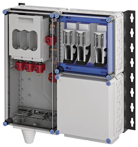 Wechselrichter-Sammler nach IEC 61439 für PV-Anlagen werden anschlussfertig geliefert. Die Gehäuse aus hochwertigem Thermoplast sind schutzisoliert, Schutzart IP 54. Wechselrichter-Sammler können um die Funktion Blitz- und Überspannungsschutz erweitert werden. Sie sind für die geschützte Installation im Freien geeignet und UV-beständig. PV-Wechselrichter-Sammler bis 140 kVA mit NH 000-Sicherungslasttrennschalter. Max. 3 x 3~ Wechselrichter. Wandbefestigung über Montageschienen aus verzinktem und pulverbeschichtetem Stahlblech.