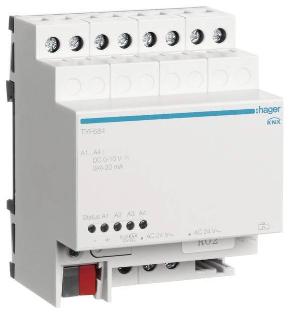 Analogaktor 4fach REG KNX. Analogaktor empfängt KNX Telegramme und wandelt diese, z.B. für die Heizungs-, Klima- und Lüftungstechnik in Strom- und/oder Spannungssignale um. Der Aktor besitzt 4 unabhängigen Analogausgängen. Art des Signalausgangs (0 bis 10 V, 0 bis 1 V, 0 bis 20 mA, 4 bis 20 mA) zusätzlich ist der Ausgangsstatus über Status- und/oder Schaltobjekt auswertbar. Der Aktor ist erweiterbar mit Erweiterungsanalogmodul TYF684E mit weiteren 4 analogen Ausgängen. Die Spannungsausgänge werden auf Kurzschluss überwacht. Der Aktor hat eine Systemschnittstelle zum Anschluss der Erweiterungsmodule. Das Gerät verfügt über eine Programmiertaste mit roter LED. Über eine grün/roter LED (Betrieb/Fehler) werden die beiden Status angezeigt. Busanschluss über Anschlussklemme. Anschluss der Ausgänge mit Schraubklemmen. Der Aktor benötigt für den Betrieb eine Spannungsversorgung 24 V AC. Jeder Kanal kann separat programmierbar werden. Nicht benötigte Ausgänge lassen sich abschalten. Das Format des Eingangswertes beträgt 8 Bit oder 16 Bit. Beim Dimmaktorbetrieb 8-Bit bei den Eingangsobjekten. Es können zwei Zwangsführungen ausgeführt werden. Die Eingangsgrößen werden zyklisch Überwacht. Die Reaktion bei Überschreiten der Überwachungszeit ist einstellbar. Verhalten bei Busspannungsausfall ist einstellbar, sowie das Verhalten bei Busspannungswiederkehr.