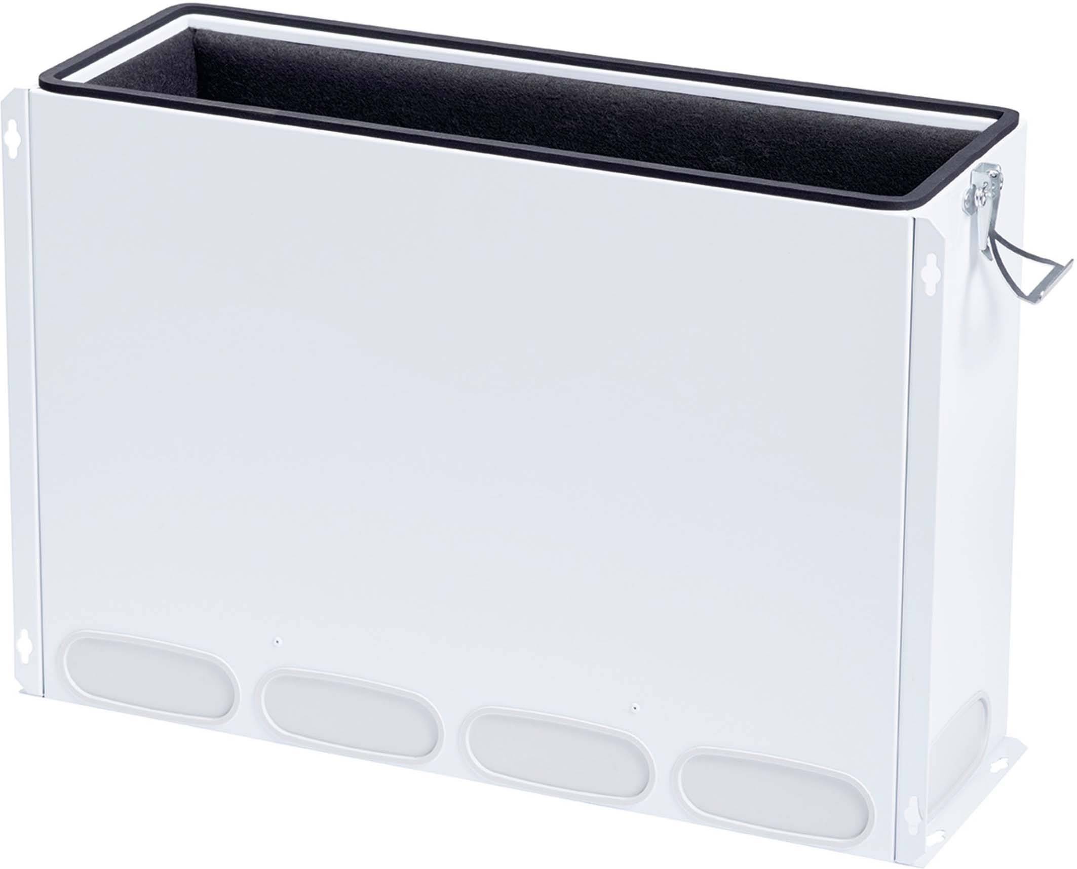 Luftverteiler/-sammler für Luftschlauch flach, Höhe 420 mm inkl. Bau-Schutzabdeckung, schalldämpfend und strömungsoptimiert., universell einsetzbar zur Montage -auf dem Dachboden, -an der Wand, -unter der Decke, -oder eingehängt in einen Deckendurchbruch einer Rohbetondecke (bei Verlegung des Luftschlauches auf der Rohbetondecke) max. Luftdurchsatz 360 m3/h, mit insgesamt 18 Anschlüssen geeignet für Luftschlauch flach 52 x 132 mm BxHxT 603 x 420 x 210 mm. Hinweis: Universal EPP Anschlussadapter für Luftverteiler/-sammler zwingend erforderlich