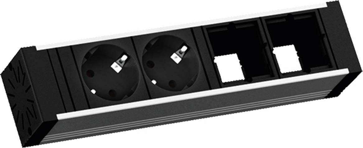 VENID ALU Steckdosenleiste Länge: ca. 229 mm 4-fach mit erhöhtem Berührungssschutz 2xSchutzkontaktsteckdosen 35° schwarz 2xCustom Module leer Stromeingang: 0,2m H05VV-F 3G1,5mm² schwarz mit GST18 Stecker inkl. Haltewinkel verpackt im Karton