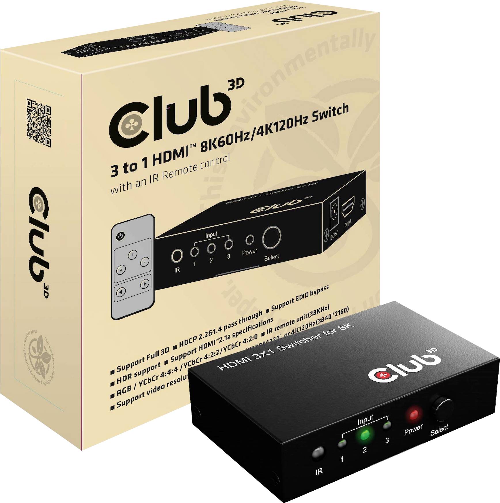 Der Club 3D CSV-1381 ist ein HDMI™2.1a. 3 auf 1 Switch, der Ihr High-Definition-Video und digitales Audio von einem der HDMI™-Eingänge an einen 8K60Hz/4K120Hz