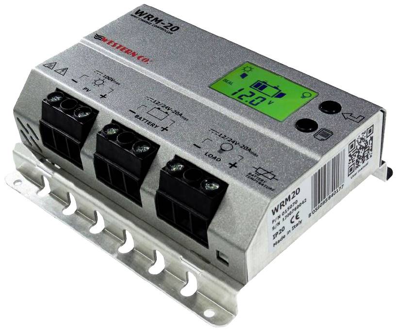 Das WRM20 ist die Komplettlösung zur Verwirklichung von inselförmigen Solarsystemen, zur Energieversorgung von Ampeln und Beleuchtungssystemen, Geräten mit niedriger Spannung und zum Laden von Batterien in Wohnmobilen und Wasserfahrzeugen. Die verschiedenen dem Benutzer zur Auswahl stehenden Ladeprogramme machen das WRM20 zur Komplettlösung bei vielen Anwendungen; zum Beispiel zum Speisen von Kameras, die nur tagsüber funktionieren sollen, oder zur Energieversorgung von Beleuchtungskörpern oder Ampeln, die nur in der Nacht funktionieren sollen, oder zur Energieversorgung von Beleuchtungssystemen, die für eine gewissen Stundenanzahl funktionieren sollen. Ein großzügiges Display zeigt die Batteriespannung, den Ladestrom vom Solarmodul, den mit dem Ausgang verbundenen Ladestrom und andere Variablen an. Das Modell WRM20+ ermöglicht, zu ihm das WRD-Display von Western CO. über den Datenlogger und die Fernbedienung anzuschließen. Die Fa. Western CO. liefert das Kommunikationsprotokoll an dieser Schnittstelle, und der Bediener kann daher seinen eigenen Datenlogger oder seine Fernbedienung implementieren