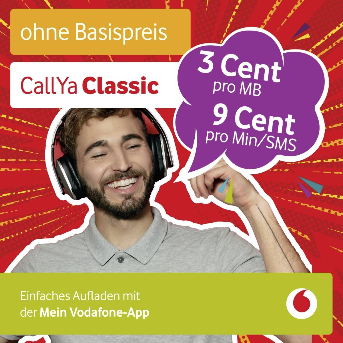 Der Vodafone-Prepaid Tarif CallYa Classic hat keinen monatlichen Basispreis und ist für alle, die gerne Ihre Kosten in Kontrolle halten wollen und gleichzeitig flexibel bleiben wollen. Dieses Prepaid-Paket enthält eine CallYa Classic Triple-SIM mit einem Startguthaben von 10 Euro. Zahle nur das, was du wirklich verbrauchst - 9 Cent pro Min/SMS und 3 Cent pro MB. Und das alles mit ausgezeichneten 5G-Highspeed in bester D-Netz-Qualität. EU-Roaming ist natürlich inklusive.