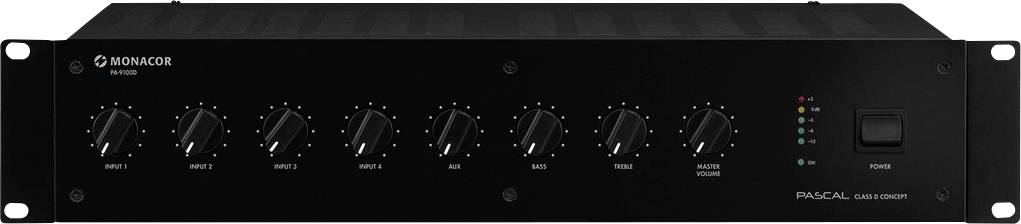 1 x 1000 W Class-D-Konzept mit PASCAL-Verstärkermodul Stromsparendes Konzept durch hohen Wirkungsgrad Gewichtsreduzierte Konstruktion durch kompaktes Schaltnetzteil Geräuschloser Betrieb durch lüfterloses Kühlkonzept 4 symmetrische Mic/Line-Eingänge Mic 1 mit Vorrangschaltung und Auto-Talkover Zusätzlicher Anschluss für Tischmikrofon über Schraubterminal 1 Aux-Eingang Lautsprecherausgänge über Schraubkontakte Line-Ausgang Einschleifmöglichkeit für z. B. Effektgeräte, Equalizer, Feedback-Controller Ein- und Ausgangspegelregler 2-fach-Klangregelung für den Ausgang 48-V-Phantomspeisung pro Mikrofoneingang, einzeln schaltbar Limiter-Schalter 4 Ω/8 Ω/100 V Montagewinkel abnehmbar