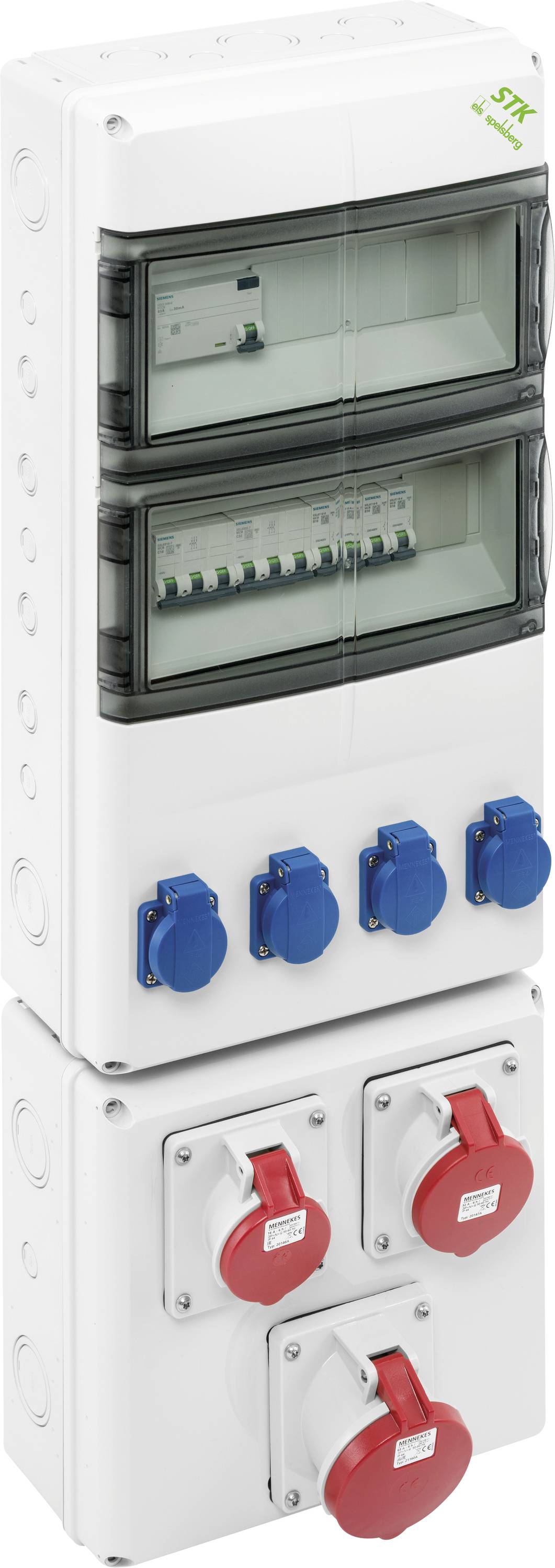 Steckdosenkombination, mit Schutzart IP44, anschlussfertig nach EN61439-3, mit zentraler Anschlussklemme 4 - 25mm², 5-polig, auch geeignet zum Durchschleifen der Zuleitung, werkzeuglos entnehmbare Normschienen zur einfachen Leitungsverlegung im Gehäuse, CEE-Steckdosen mit 20°Neigung, einfache Kombination mit STK-Zusatzgehäusen oder AK Air Verteilern mit Flanschöffnungen (AK-F), inkl. Flansche, verfügbare Teilungseinheiten: 28 bestückt mit: 4 x Leitungsschutzschalter C16A, 1-polig 1 x Leitungsschutzschalter C16A, 3-polig 1 x Fehlerstrom-Schutzschalter (RCCB), 63/0,03A, 4-polig, Type A 4 x SCHUKO®-Steckdose (frontseitig), 230V 1 x CEE-Steckdose (frontseitig), 16A, 400V 1 x CEE-Steckdose (frontseitig), 32A, 400V 1 x CEE-Steckdose (frontseitig), 63A, 400V Abmessungen: 315 x 1050 x 232 mm