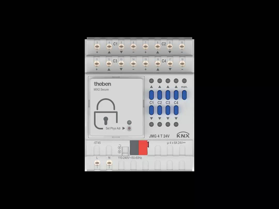 KNX Jalousieaktor, 4-fach Antriebssteuerung 24V, Grundgerät, Reiheneinbaugerät, Breite 4 TE (4 TE), erweiterbar mit JME 4 T bis zu 12 Kanäle oder kombinierbar mit anderen Geräten der MIX-Serie. Relaisausgänge für vier Antriebe, Antriebe: z. B. für Jalousien, Rollladen, Markisen, manuelle Bedienung am Gerät, Schlupfkorrektur, Antrieb frei parametrierbar, Handschalter AUF/AB und LEDs