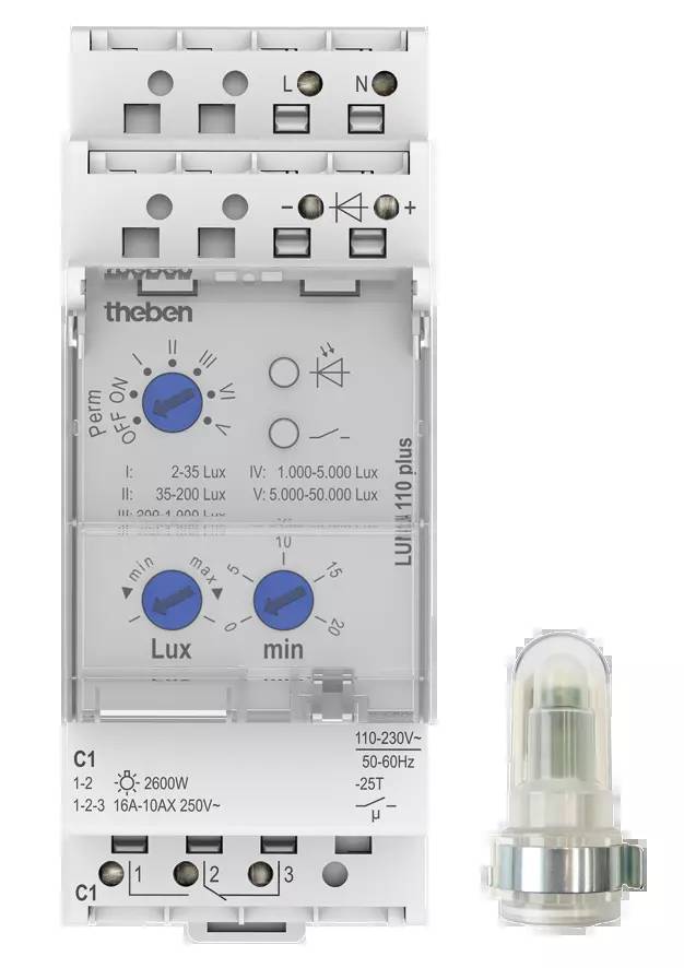 Analoger Dämmerungsschalter, externer Aufbau-Lichtsensor im Lieferumfang, einstellbare Ein- und Ausschaltverzögerung, Anzeige des Kanal- und Schaltzustandes, DuoFix-Federsteckklemmen, Erweiterter Helligkeitsbereich und einstellbare Verzögerungszeit, 600 Watt LED-Leistung, Nulldurchgangsschaltung zur Schonung von Relais-Kontakt und Leuchtmittel für eine höhere Lebensdauer, Permanent-AUS und Permanent-EIN Funktion am Potenziometer einstellbar, Test-Funktion, Schalthelligkeit stufenlos einstellbar