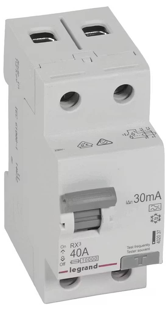 NUTZEN: Der RX³ Fehlerstromschutzschalter Typ A dient zur Erfassung von Wechsel- und pulsierenden Gleichfehlerströmen nach VDE 0664-10, EN 61008-1. Er ist unverzögert und garantiert eine erhöhte Betriebssicherheit durch verminderte Fehlauslösungen.;INSTALLATION: Ihnen wird eine einfache Befestigung des Schutzschalters mit 2 Teilungseinheiten (TE) auf Hutprofilschienen der Norm EN 60715 durch rastende Schnellbefestigungen gewährt.;BENUTZERFREUNDLICHE ANZEIGE: Der Fehlerstromschutzschalter zeigt eine klare Information vorne auf jedem Gerät und ist mit einer Kennzeichung der Schalteinstellung On/Off mit Beschriftungsfeld ausgestattet.;HINWEIS: Der Anbau von Hilfsgeräten ist nicht möglich.;Legrand Fehlerstromschutzschalter RX3, Typ A, für Wechsel- und pulsierende Gleichfehlerströme nach VDE 0664-10, EN 61008-1, unverzögert, 2-polig, Bemessungsstrom In 40 A, Bemessungsfehlerstrom Idn 30 mA, Bemessungsspannung Un 230 VAC, Bemessungsfrequenz 50 Hz, Stoßstromfest bis 250 A, Bemessungskurzschlussstrom 10 kA bei geeigneter Vorsicherung, Befestigung auf Hutprofilschiene EN 60715 durch rastende Schnellbefestigungen, klare Information vorne auf jedem Gerät, eindeutige Schaltstellungsanzeige rot/grün am Schalthebel, mit Beschriftungsfenster, mit Untersteckschutz zum sicheren Einführen des Leiters in Fahrstuhlklemme, Anbau von Hilfsgeräten möglich.