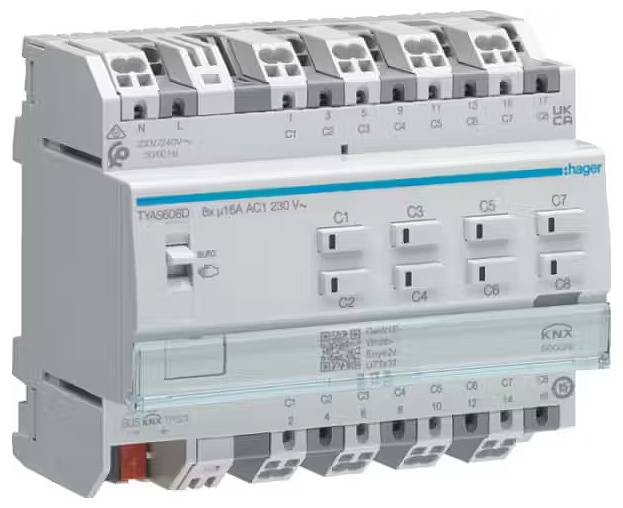 Schalt-/Jalousieaktor 8/4-fach KNX Secure, 16A, C-Last.KNX Secure Schaltausgang zum Schalten von 8 Steckdosen-/Beleuchtungsausgängen oder 4 Jalousien.