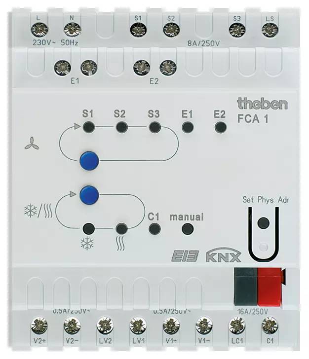 Reiheneinbaugerät, Breite 4 TE, steuert Fan Coils mit bis zu 3 Lüfterstufen (8 A) und das Heiz-bzw. Kühlventil (Triacs), Es werden 2 Rohr und 4 Rohr-Systeme unterstützt, Dabei können 2 Punkt und 3 Punkt-Ventile angesteuert werden, Über ein Zusatzrelais (16 A) ist das Ansteuern von wahlweise eines elektrischen Heizregisters oder eines elektrischen Kühlregisters möglich