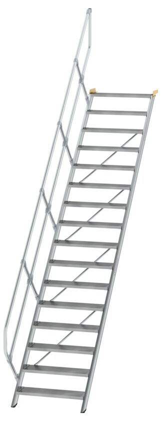 Ortsfeste Treppe aus Aluminium mit Neigung 45°. Stufenbreite: 800 mm. Stufentiefe: 225 mm. Stufenausführung standardmäßig in Aluminium geriffelt (R 9), optional auch mit anderen Belägen erhältlich. Handlauf einseitig Ø 40 mm mit verschraubten Verbindungselementen serienmäßig (Höhe: 1.100 mm). Zweiter Handlauf optional (bei Wandabstand kleinergt/größer120 mm nach DIN EN ISO 14122-3 erforderlich). Bei Treppen mit Stufenbreite 800 oder 1.000 mm ist ab 3.300 mm senkrechter Höhe eine mittige Abstützung erforderlich (gegen Mehrpreis oder bauseits). Einfache Montage durch Lieferung in vormontierten Baugruppen inklusive Montageanleitung. Maximale Belastung: Stufenbelastung 150 kg, Gesamtbelastung 300 kg. Hinweis: Im Standard sind Verbindungsteile aus verzinktem Stahl enthalten, welche für den Innenbereich geeignet sind. Gegen Mehrpreis können diese auch in Edelstahl ausgeführt werden, was für den Außenbereich empfohlen wird
