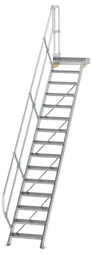 Ortsfeste Treppe mit Plattform aus Aluminium und Neigung 45°. Stufen- und Plattformbreite: 600 mm. Plattformlänge: 460 mm. Letzte Stufe (Tiefe: 225 mm) auf gleicher Höhe wie Plattform montiert (Gesamttrittfläche: 685 mm). Stufen- und Plattformausführung standardmäßig in Aluminium geriffelt (R 9), optional auch mit anderen Belägen erhältlich. Handlauf und Geländer einseitig Ø 40 mm mit verschraubten Verbindungselementen (Höhe: 1.100 mm) serienmäßig. Stirnseitiges Geländer gegen Mehrpreis erhältlich. Zweiter Handlauf optional (bei Wandabstand kleinergt/größer120 mm nach DIN EN ISO 14122-3 erforderlich). Untere Holmenden mit robusten Fußwinkeln zur Bodenbefestigung. Einfache Montage durch Lieferung in vormontierten Baugruppen inklusive Montageanleitung. Bei Treppen mit Stufenbreite 800 oder 1.000 mm ist ab 3.300 mm senkrechter Höhe eine mittige Abstützung erforderlich (gegen Mehrpreis oder bauseits). Sofern bauseits keine Auflageflächen oder Befestigungen vorhanden sind, muss die Befestigung über eine Dreieckskonsole erfolgen. Maximale Belastung: 1,5 kN/m2, Stufenbelastung 150 kg, Gesamtbelastung 300 kg. Hinweis: Im Standard sind Verbindungsteile aus verzinktem Stahl enthalten, welche für den Innenbereich geeignet sind. Gegen Mehrpreis können diese auch in Edelstahl ausgeführt werden, was für den Außenbereich empfohlen wird