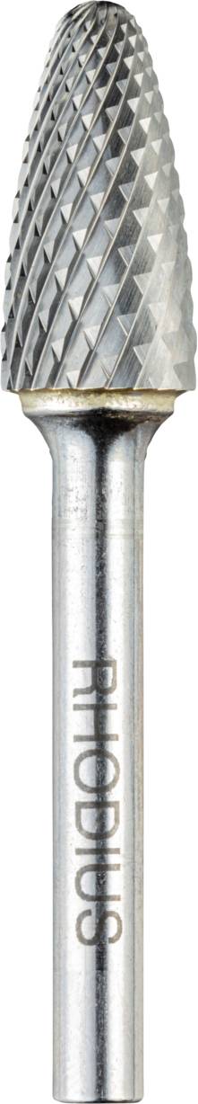 Maschineneignung: Der Hartmetallfrässtift HF F PRO kann mit Geradschleifern, Maschinen mit Biegwellenantrieb und Druckluftschleifern eingesetzt werden. Die empfohlene Schnittgeschwindigkeit liegt für unlegierte Stähle/Stahlguss/Gusseisen bei 450-600 m/min, für legierte Stähle/Werkzeugstähle/rost- und säurebeständige Stähle bei 250-350 m/min. Die empfohlene Schnittgeschwindigkeit für Aluminium sowie weitere NE-Metalle wie Kupfer, Messing, Bronze und Kunststoffen liegt bei 700-900 m/min. Aufbau und Herstellung: Der Kopf wird mit einem speziellen Hartlötverfahren angebracht, die Verzahnung erfolgt mit Präzisionsdiamantscheiben auf modernsten CNC-Maschinen. Durch dieses Verfahren wird eine optimale und leistungsstarke Schneidengeometrie ermöglicht. Qualität: Der Anwender erhält mit dem HF F das beste RHODIUS Werkzeug seiner Kategorie. RHODIUS TOPline Produkte stehen für ein Höchstmaß an Leistung und Qualität. Anwendung: Hartmetallfrässtift HF F PRO überzeugt mit einer hohen Rundlaufgenauigkeit. Auch bei weniger aggressiven Zerspanung lässt er sich leicht führen. Der Anwender kann sehr präzise fräsen. Zudem punktet der HF F PRO , dank seiner sehr stabilen Zahnausführung, mit einer hohen Standzeit. Abmessung: Der Frässtift mit der Form F (Rundbogen) nach DIN 8032 ist mit Kopfdurchmessern von 6 mm bis 12,7 mm erhältlich. Der Schaftdurchmesser beträgt 6 mm. Hinweis: Für diesen Hartmetallfrässtift sind Sonderanfertigung mit Schaftlängen bis 400 mm möglich.