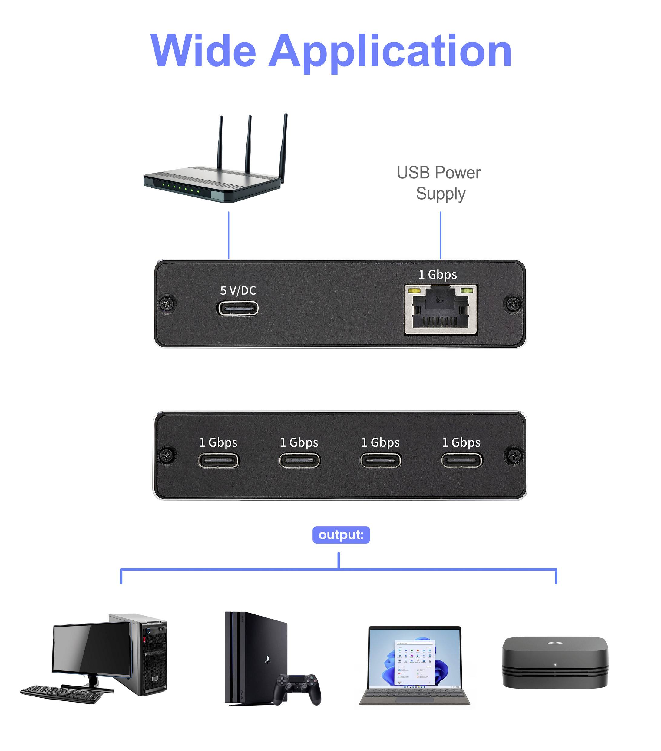 Vierfach-Konnektivität: Der Splitter ermöglicht die gleichzeitige Nutzung des am RJ45 Port angeschlossenen Gigabit Ethernet mit bis zu vier Geräten über die USB-C® Ports.