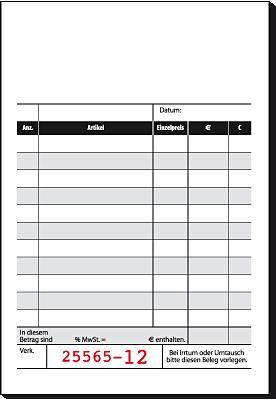 Kassenblock mit Additionsblatt im Format ca. 100 x 165 mm, mit 50 Originalen + 50 Kopien, mit fortlaufender Nummerierung auf Original und Kopie. Die Kopie ist zur besseren Unterscheidung in rot gedruckt. Auf dem Additionsblatt (sog. Rechenliste) können sämtliche Rechnungsbeträge der einzelnen Rechnungen aufaddiert werden. Geeignet für handgeschriebene Kassenzettel bei der Führung eine sog. "offenen Ladenkasse".