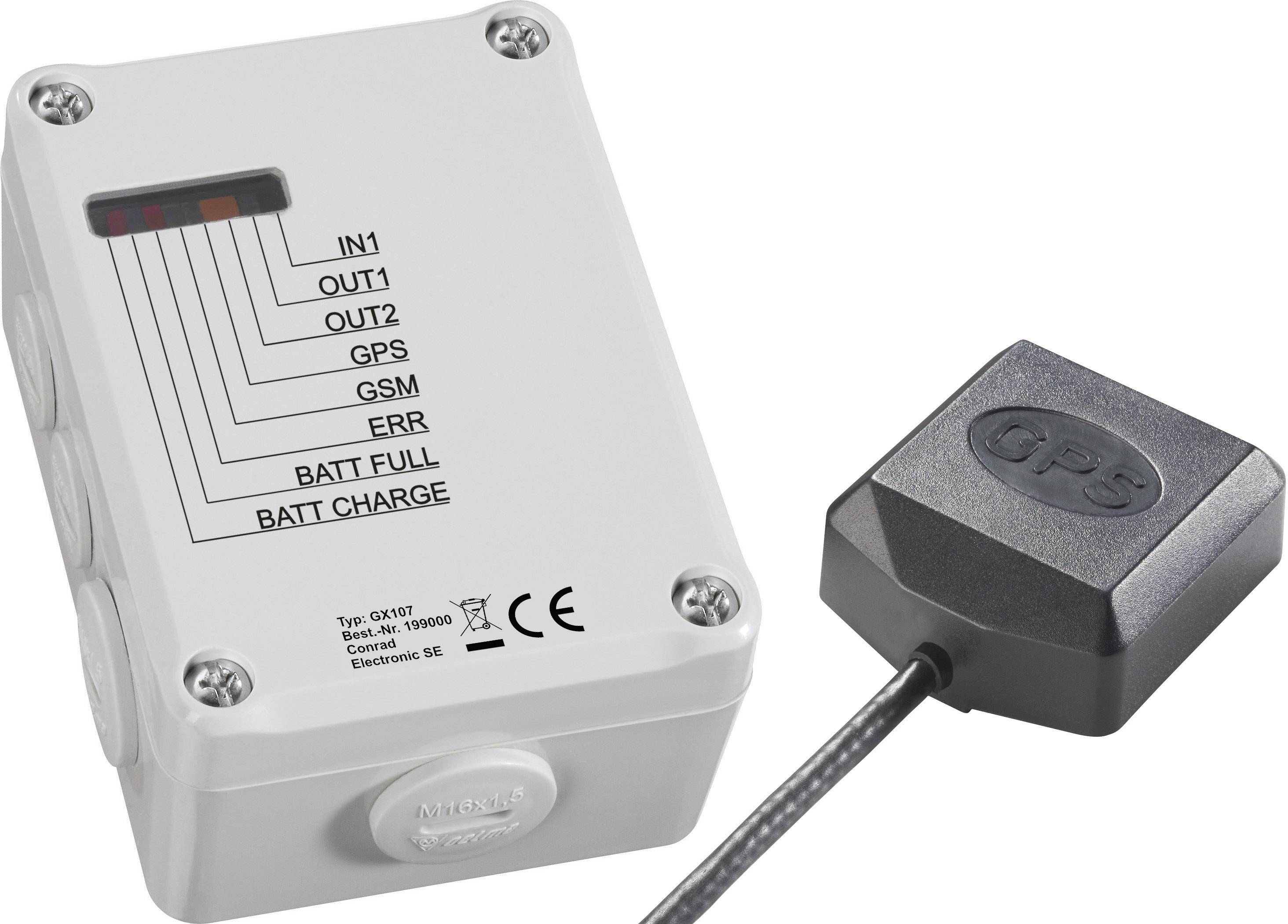 GSM-Modul GX107 · Eingebauter 1100 mAh LiPo-Akku · Integrierte GSM-Antenne · Kabeldurchführungen und Verschlussstopfen, IP66 konform · GPS Antenne · Bedienungsanleitung.
