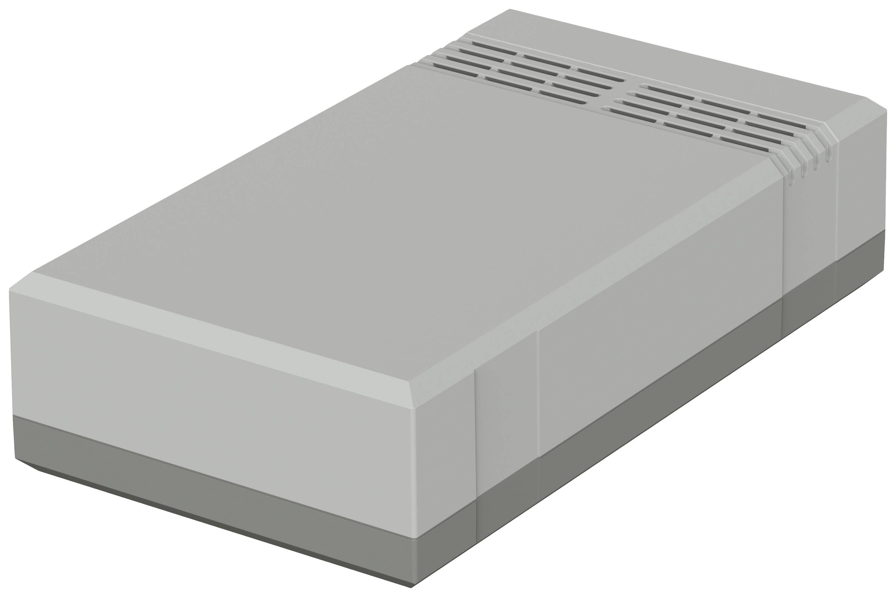 Für die Wandbefestigung befinden sich vorgeprägte Durchbrüche im Unterteil des Gehäuses · In jeder Gehäusehalbschale sind Montagenocken für selbstformende Schrauben sowie Führungsnuten für die senkrechte Platinenmontage vorhanden · Unterteil Achatgrau ähnlich RAL 7038.