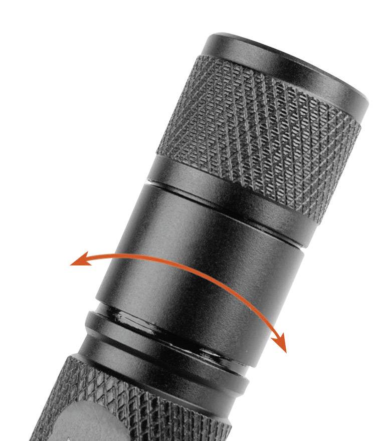 Digital geregelt für weitgehend konstante Helligkeit · Bedienung über Drehschalter · Aus extrem robustem und langlebigem Flugzeug-Aluminium Typ III, hartanodisiert · Schlagfeste, extrem klare Glaslinse mit Anti-Reflex-Beschichtung · Verpolungsschutz · LED-Lebensdauer ca 100000 h · Wasserdicht IPX8 bis 2 m · Anti-Roll-Design · Sehr griffige Oberfläche · Vorrichtung für Handschlaufe · Nach ANSI/NEMA FL-1 Standard geprüft.