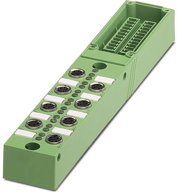 Sensor-/Aktor-Box-Grundgehäuse, Anschlussart: M8-Buchse Metall, Anzahl der Steckplätze: 8, Polzahl: 3, Steckplatzbelegung: einfach, Statusanzeige: Ja, pnp; Stammleitungsanschluss: Steckbarer Schraubanschluss, Schirmung: nein