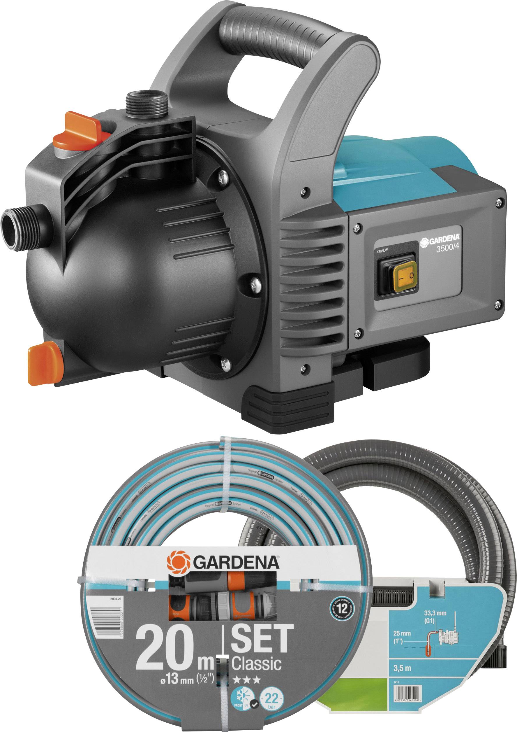 • Gartenpumpe inkl. 20 m 13 mm (1/2")-Schlauch inkl. Armaturen und 3,5 m Sauggarnitur.
