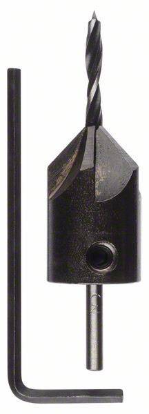 Der Holzspiralbohrer mit Senker bohrt, senkt und entgratet effizient in einem Schritt in Holz. Auf einem Holzspiralbohrer montiert können alle drei Vorgänge gleichzeitig erledigt werden. Der Senker ist für hartes und weiches Holz geeignet, für laminierte und nicht laminierte Spanplatte sowie für Sperrholz. Er ist für Standbohrmaschinen und Bohrschrauber vorgesehen. Dieser Multifunktionsbohrer aus Werkzeugstahl besitzt einen Senkwinkel von 90 Grad, fünf Schneidekanten und kann auch als Tiefenanschlag verwendet werden. Der Senker beinhaltet einen Sechskant-Stiftschlüssel, einen Holzspiralbohrer und einen auf dem Aufsteckhalter montierten Kegelsenker. Durchmesser (D) mm: 3,00, Außendurchmesser mm: 16