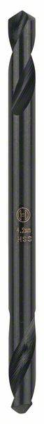Mit dem geschliffenen HSS-Doppelendbohrer kann man doppelt so lange bohren Der Bohrer ist an beiden Enden mit Bohrspitzen und Spiralnuten versehen. Er ist ideal für Montage-, Karosserie- und Metallarbeiten geeignet. Mit ihm lassen sich auch Nietlöcher oder Löcher in dünnes Material bohren. Dieser Bohrer ist für Nichteisenmetalle, Stahlblech und Kunststoff geeignet. Er wird mit Handgeräten (Bohrschraubern) und Bohrständern benutzt. Der Bohrer ist außerdem besonders kurz und robust, also zum Arbeiten an engen Stellen geeignet. Die Bohrspitze mit Kreuzanschliff ermöglicht aktiven Bohransatz und Zentrieren ohne Wandern. Ankörnen erübrigt sich somit. Durchmesser (D) mm: 4,20, Arbeitslänge (L1) mm: 14, Gesamtlänge (L2) mm: 55