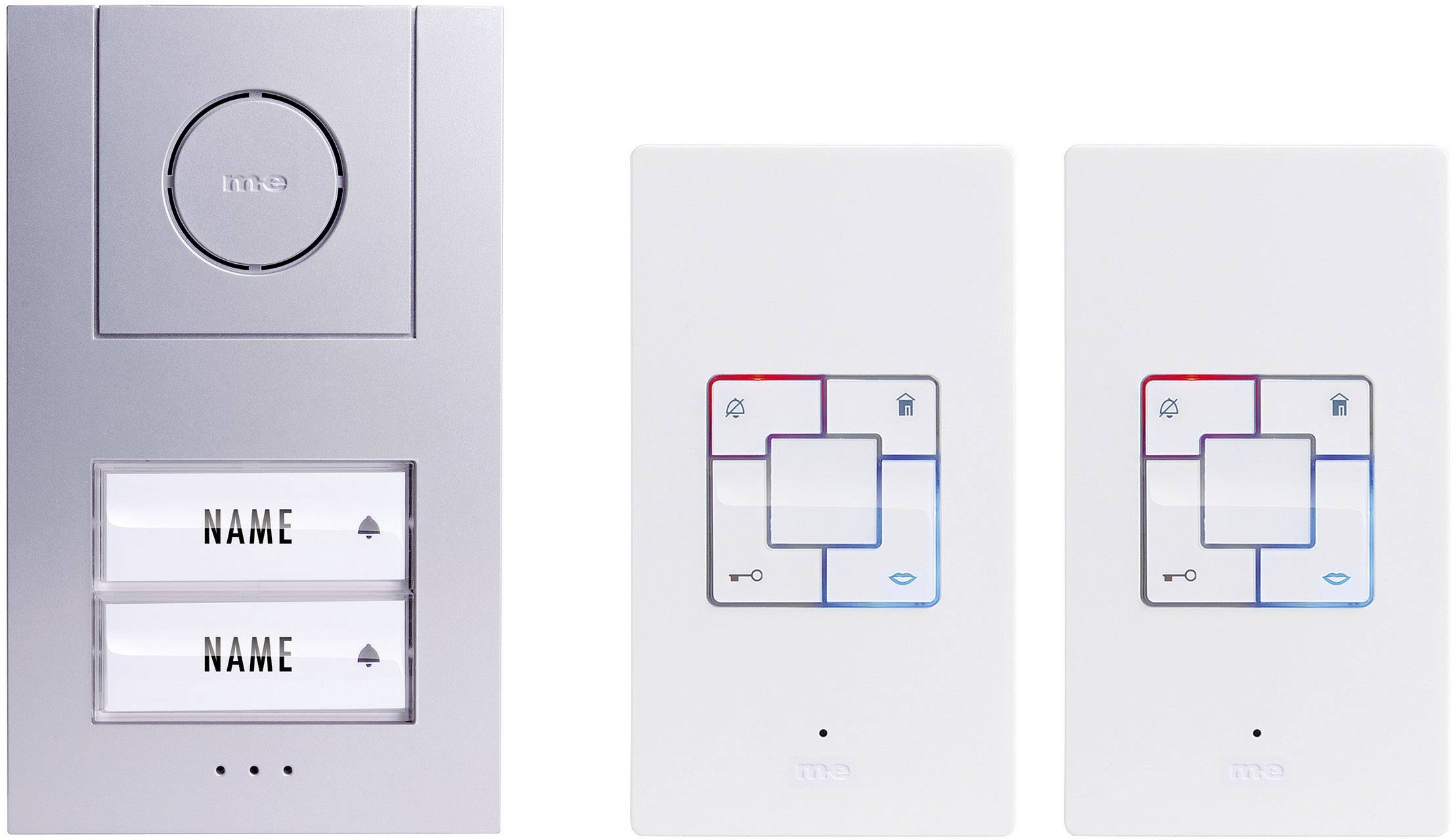 Audio-Türsprechanlage mit Türöffner-Signal und Intercom-Funktion. Geringer Stromverbrauch unter 1 W (StandBy-Betrieb). Anschluss des Netzadapters wahlweise an Außen- oder Innenstation. Das Set ist erweiterbar auf bis zu 4 Außenstationen und auf bis zu 4 Innenstationen pro Wohneinheit. Außenstation: Hochwertiges Kunststoffgehäuse mit silbermetallic Beschichtung. Gleichmäßige weiße LED-Beleuchtung der Klingeltaster, welche Helligkeitsabhängig ein-/ausschaltet. Nur 26 mm flache Aufputzmontage. Mit Anschluss an vorhandene Türöffneranlage. Die Öffnungszeit des Türöffners ist einstellbar (1 oder 5 Sek) und Türöffnung wird optisch und akustisch angezeigt. Innen-Station: Optische Klingelanzeige: blauer Leuchtrahmen um den Sprech- und Türöffner-Taster. Die Klingel-Lautstärke ist stufenlos einstellbar. Über den Ruhe-Taster schalten Sie den Klingelton ab (z.B. bei Nachtruhe) - ein roter Leuchtrahmen blinkt zur Erinnerung. Mit Intercom-Funktion: Sprechen von Innenstation zu Innenstation innerhalb einer Wohneinheit. Nur 22 mm flache Aufputzmontage. Anschluss für Etagen-Klingeltaster mit eigenem Klingelton zur Unterscheidung von Haus- und Wohnungstür.