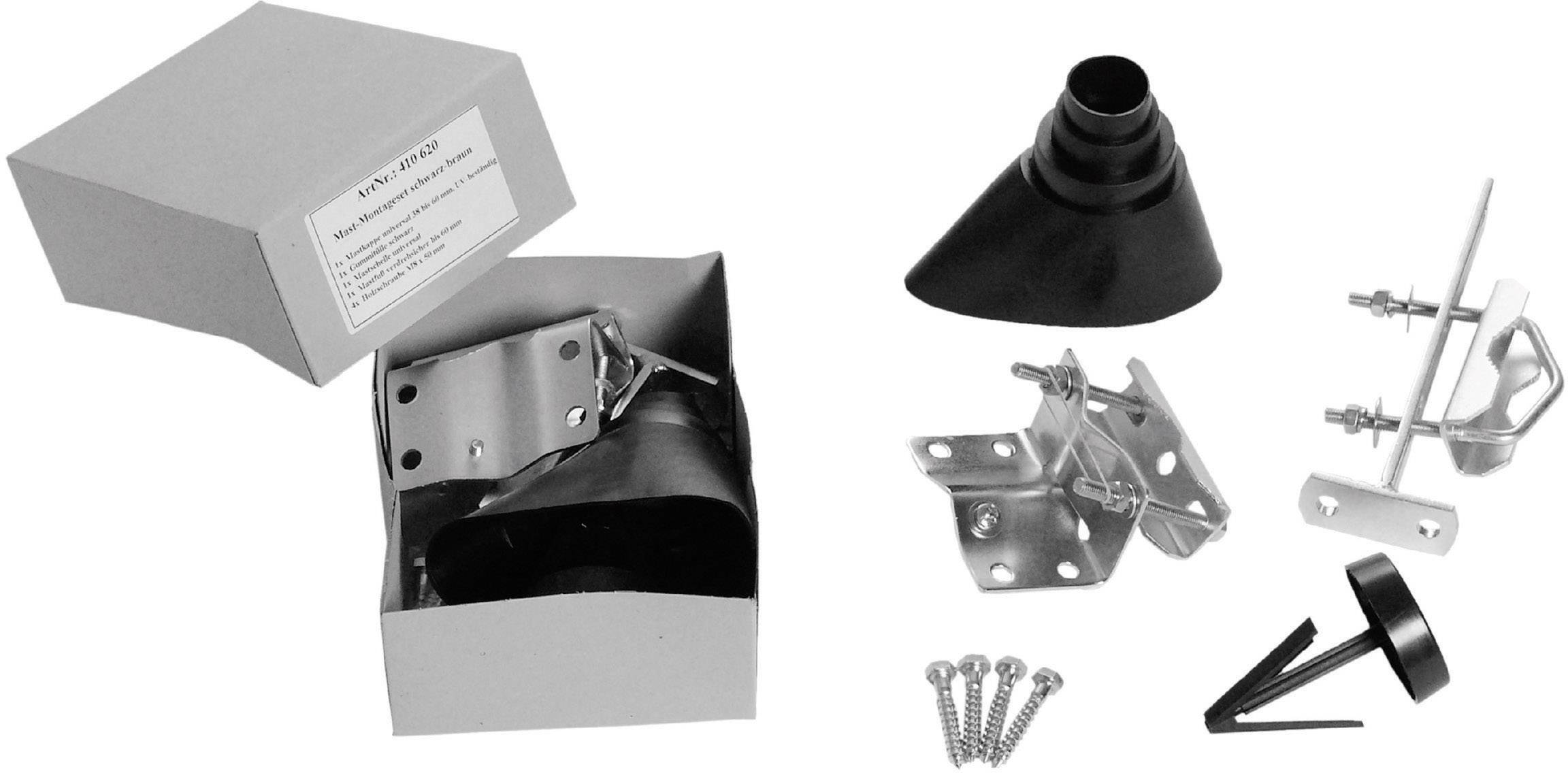 1x Gummitülle für Masten Ø 38 - 60 mm + 1x Mastfuß für Masten bis Ø 60 mm + 1x Mastschelle universal für Masten von Ø 38 - 60 mm + 1x Mastkappe für Rohre + 4x Holzschraube 8 x 50 mm.