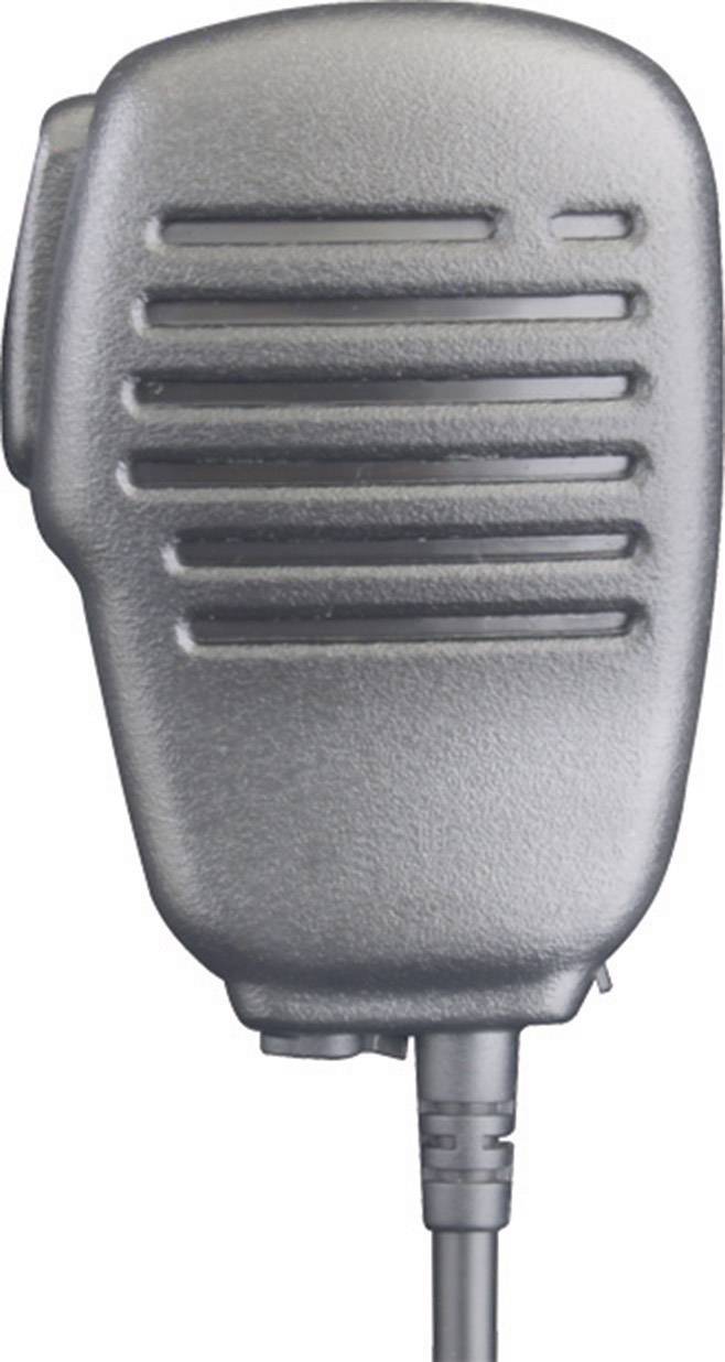 Handliches Handmikrofon mit integrierten Lautsprecher und PTT-Taste.